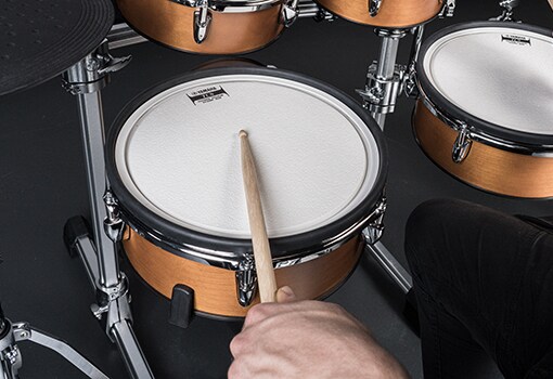 Les peaux Yamaha TCS (Textured Cellular Silicone) présentent une structure interne unique qui offre une réponse réaliste avec une dureté et un rebond réalistes, ainsi qu'une surface traitée qui empêche le glissement des baguettes. Le résultat est une sensation de batterie naturelle qui vous encourage à continuer à jouer.