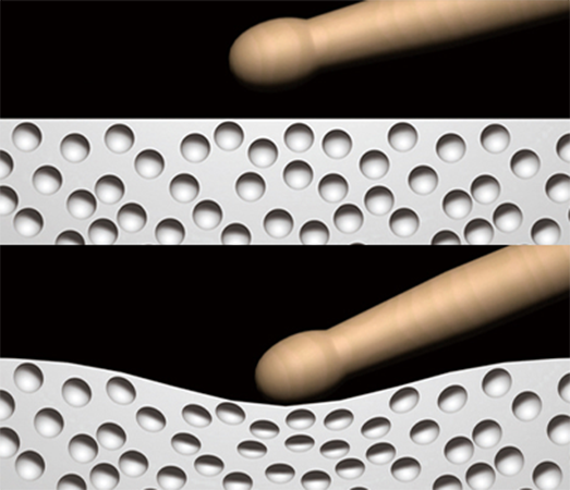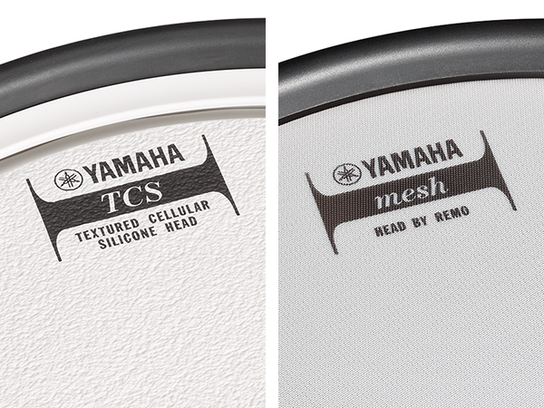 Les peaux Yamaha TCS (Textured Cellular Silicone) utilisent un matériau en mousse de silicone qui contient de nombreuses bulles d'air, offrant une fermeté et un rebond précis. Les bulles d'air à l'intérieur servent de coussin, adoucissant le son de l'impact et réduisant la tension sur les poignets et les coudes. La surface de la peau est identique à celle d'une peau "coated", et empêche les baguettes de glisser.