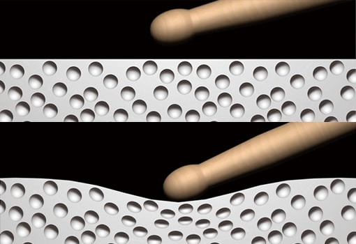 La caisse claire et les toms offrent une sensation très proche de leurs homologues acoustiques respectifs. Leurs surfaces ne se détendront jamais, quel que soit le nombre de fois où elles sont frappées, ce qui permet de conserver la meilleure sensation possible à tout moment.