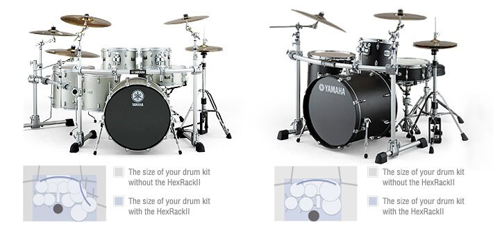 L'ensemble HEXRACKII de base se compose de deux pieds et est entièrement compatible avec le matériel du système Yamaha. Par rapport à une installation matérielle typique, le HEXRACKII utilise moins d'espace et réduit l'encombrement au sol produit par les pieds du stand, etc. autour du kit. Les tubes et les racks du système sont fabriqués en aluminium, ce qui rend le système plus léger, le transport et l'installation plus faciles. Et avec une grande variété de pinces disponibles en option, le système de racks offre une grande extensibilité.