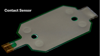 Ekuni: Next are the pickups. This model comes equipped with a pickup system with the brand name Atmosfeel™. There is a piezo pickup under the saddle, a contact sensor under the soundboard on the bass string side, and a sheet inside the body on the left side of the upper bout that has a microphone attached. These three elements comprise the pickup system. Among them, the contact sensor is particularly outstanding and exceptionally light. Here is the actual sensor. Being this light not only minimizes the effect on the sound, but it also vibrates very easily because it is so light. The high-frequency overtone components are remarkably high, and lend an expressive, airy feel.
