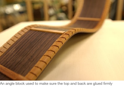 Une fois que le traitement du bois est fini, l'avant, le dos et les éclisses sont placés dans un moule et sont collés en même temps. Chaque moule est resserré autour du corps, puis est laissé de coté entre 90 et 120 minutes, le temps que la colle durcisse.