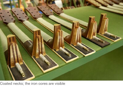 Le vernissage et le polissage sont enfin finis. Le manche et le corps sont joints. Le luthier vérifie le joint avec de l'adhésif. Il vérifie que la structure est solide et que l'instrument transmet le son correctement.