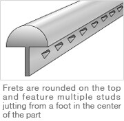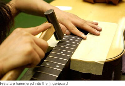 Les frettes, alliage d'argent et de nickel, sont enfoncées dans les touches. Chaque frette a un pied (environ 3 mm) doublé de clous triangulaires alternés. Cette structure permet de les fixer aux touches. Bien que les guitares ont habituellement 20 frettes, chaque frette a une largeur différente, puisque le manche s'épaissit en direction du corps.
