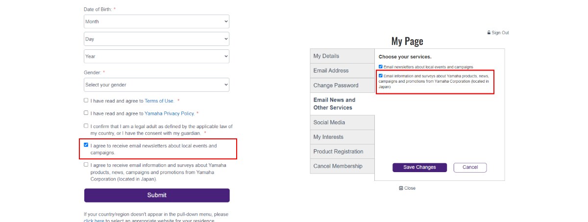 Ensuite, cochez dans la rubrique Newsletter, la case "Recevez la newsletter Yamaha Music pour obtenir les dernières mises à jour sur les produits, promotions et événements".