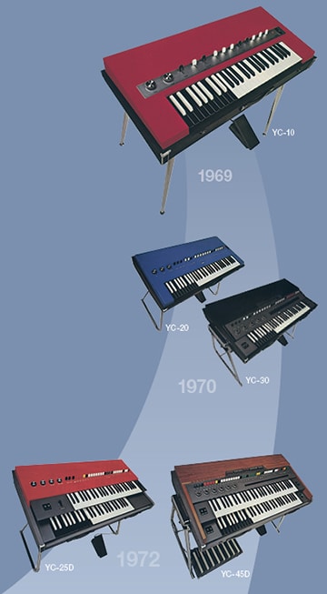 In terms of both concept and technology, the combo organs of the YC Series have had a major effect on the development of modern synthesizers. The sixties saw the kind of music played by bands such as The Beatles and The Rolling Stones become extremely popular all over the world, producing a shift in demand from organs installed permanently in churches and public facilities to highly portable organs for stage use. With its single 49-key keyboard, four color variations, and a compact design that fit neatly inside a hard, suitcase-type cover, the YC-10 was truly a next-generation organ. It also differed markedly from the Electone in that its sound was output via a separately sold guitar or bass amplifier.