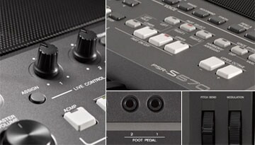Le PSR-S670 dispose de deux potentiomètres de contrôle en direct assignables à de nombreuses fonctions (Track Mute, Trigger, filtres, effets,..), une molette de modulation et deux entrées pédales assignables, pour vous permettre de créer et faire évoluer votre musique en temps réel.