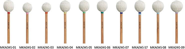 [MKA(W)-02/03] Les baguettes MKA(W)-02 et MKA(W)-03 sont équipées de manches courts, s’adaptant ainsi aux morceaux où le jeu des baguettes est rapide et délicat. De plus, le poids supplémentaire des têtes offre au percussionniste de plus grandes possibilités de style de jeu.