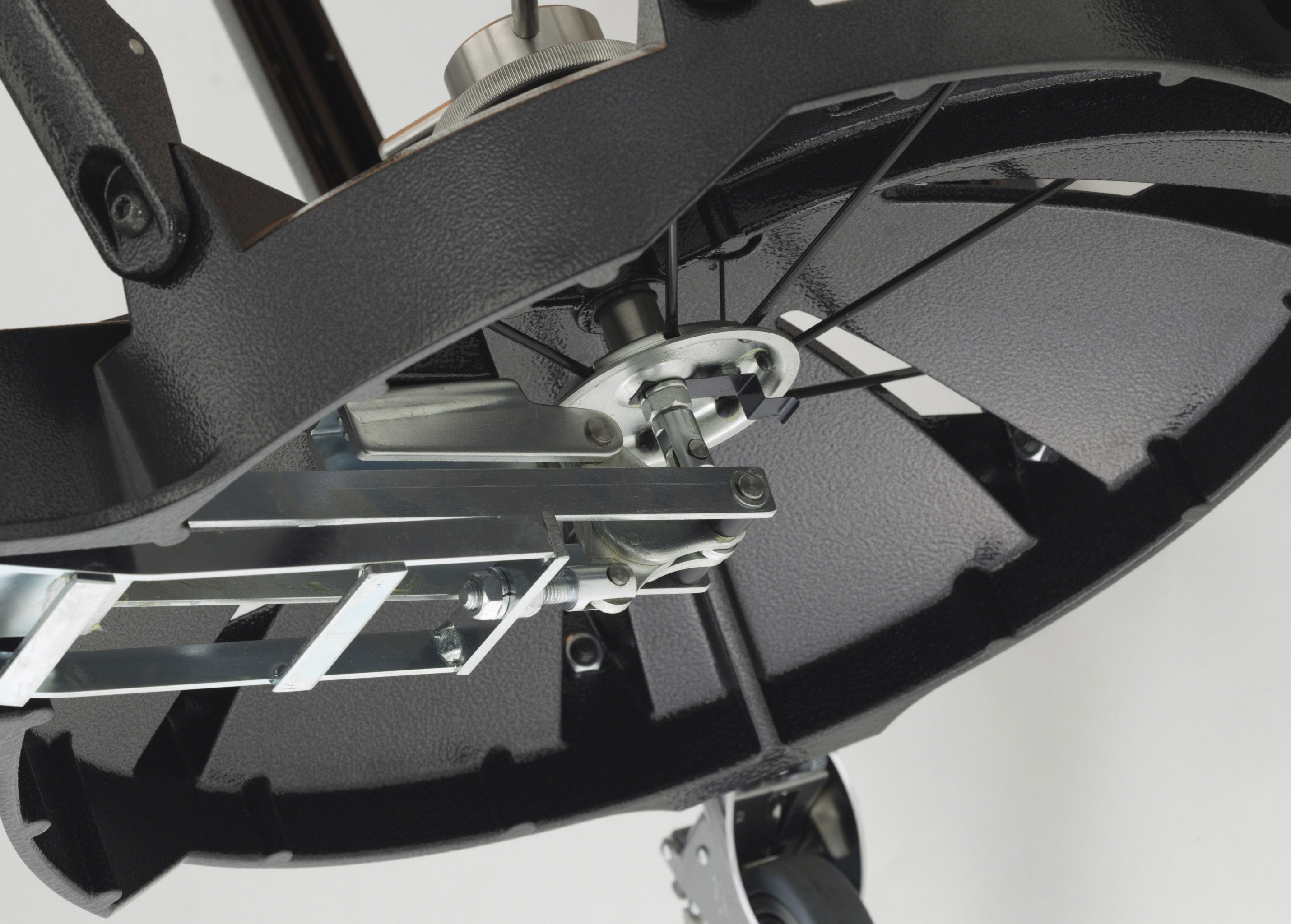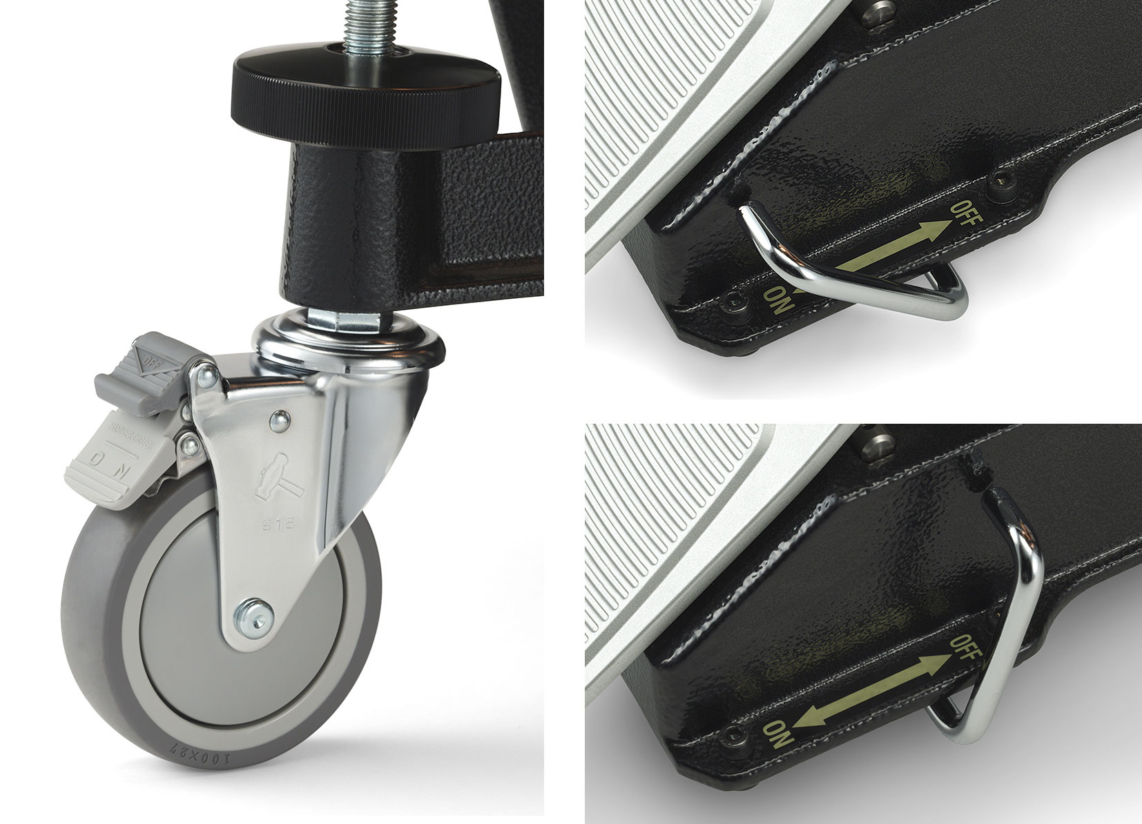 Les roulettes principales sont dotées d'un mécanisme de verrouillage à touche unique qui contribue à une mise en place rapide et sûre. En plus du mécanisme de blocage des roulettes principales, un frein auxiliaire a été ajouté à la roulette de la pédale. Le musicien peut enclencher le frein auxiliaire pour bloquer la roulette en toute sécurité et empêcher tout mouvement de l'instrument.