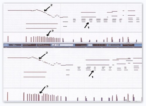 There are clear differences with regard to the precision of chords (1), the regularity of scales (2) and the homogeneity of tone and dynamics (3). On hearing the playback, the upper pianist gives a much more professional performance, and this can be confirmed visually.