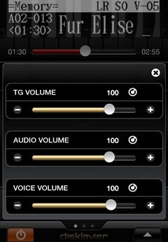Vous pouvez afficher les informations d'affichage du Disklavier sur l'écran de votre appareil iOS, de sorte que même lorsque vous êtes loin de votre piano, vous pouvez modifier ces différents paramètres. Vous pouvez également vérifier les informations des morceaux lorsque le Disklavier effectue la lecture automatique.
