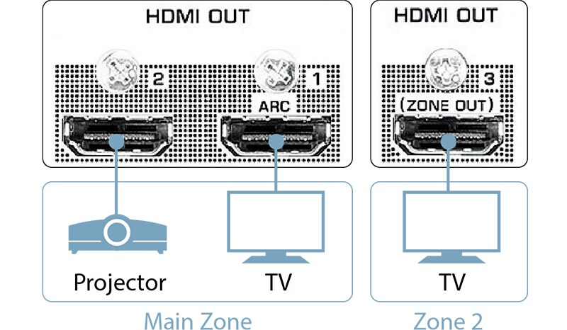 Vous pouvez transférer le contenu vidéo ou audio sur un téléviseur ou un système Home Cinema dans une autre pièce (Zone 2), via HDMI. Il ne vous reste plus qu'à profiter des images et du son diffusés dans la pièce principale (où l'amplificateur AV est installé) ou même d'un contenu différent.