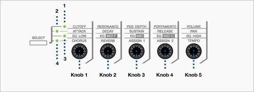 Il y a énormément de puissance musicale sous le capot du MOTIF-RACK XS et il n'y a pas de moyen plus facile d'obtenir cette puissance qu'avec les cinq boutons de commande. Ces boutons pratiques vous permettent de modifier le son de l'instrument en temps réel, ce qui vous évite d'avoir à parcourir plusieurs pages d'affichage pour accéder au paramètre que vous souhaitez modifier. Besoin d'ajuster le niveau de réverbération de la voix sélectionnée? Appuyez sur le bouton SELECT pour appeler la quatrième rangée de paramètres, puis tournez le bouton 2. Vous voulez changer rapidement la tonalité de la voix, par exemple en prenant un peu de son côté haut d'une voix de piano? Appelez la troisième rangée et ajustez les différentes bandes d'égalisation - en utilisant le bouton 5 aux aigus. Ou augmentez la basse d'une voix avec le bouton 1. Si vous voulez régler le volume de la voix sélectionnée, appelez la première rangée et tournez le bouton 5. Deux des réglages du bouton sont assignables, vous permettant de choisir vos propres paramètres préférés de contrôle personnalisé.