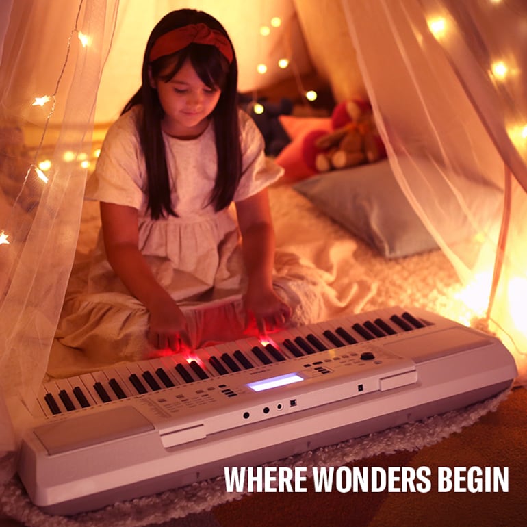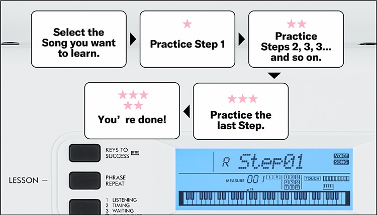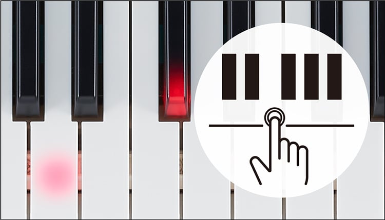 Suivez simplement les touches qui s'éclairent et interprétez de jolies mélodies, naturellement et sans difficulté. Vous deviendrez addict au plaisir procuré par la pratique musicale. Et si vous voulez vous améliorer davantage, entraînez vous à votre rythme avec les trois modes pédagogiques. Travaillez séparément les parties main droite et main gauche, et divisez le morceau en plusieurs parties pour les travailler en boucles. Les touches s'éclairent tout au long du morceau, vous guidant ainsi, même si vous ne savez pas lire la musique.