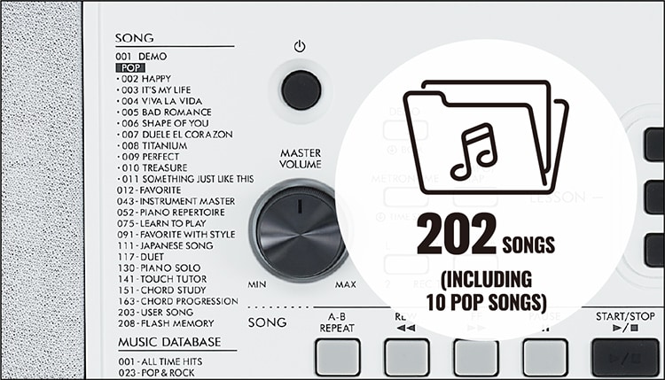 Le EZ-300 intègre 202 morceaux pour le plaisir de toute la famille, avec des succès populaires et des chansons célèbres que tout le monde a déjà entendu et souhaiterait interpréter au piano: des chansons pop, des chansons pour enfants, des morceaux classiques et plus encore. Vous pouvez vous amuser à jouer avec ces morceaux ou simplement les écouter. De plus, vous pouvez accroître le contenu du EZ-300, en le connectant à votre ordinateur pour ajouter vos morceaux favoris.