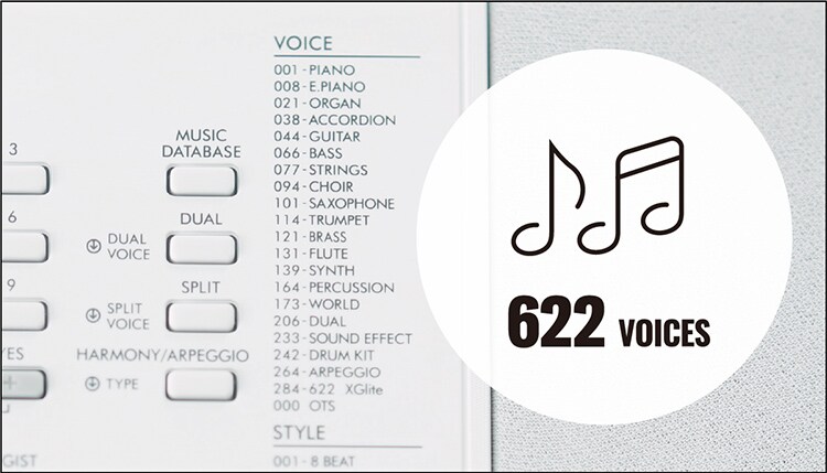 Le EZ-300 dispose d'un total de 622 sonorités intégrées (appelées "Voices"). Parmi elles, des sonorités nommées "Live Voices", sont constituées d'échantillons d'une qualité exceptionnelle, enregistrés par exemple à partir d'un piano à queue, de cordes et de cuivres. Ce clavier, à lui seul, vous permet de jouer une très grande variété d'instruments de musique avec une qualité sonore impressionnante. En outre, son clavier dynamique vous permet de contrôler de manière expressive le volume de chaque note en fonction de la force de frappe appliquée au clavier. Ainsi vous maîtrisez pleinement votre expression musicale, tout en vous amusant avec les fonctions d’accompagnement automatique et divers effets.