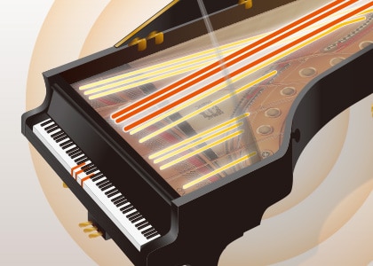 Sur un piano à queue, tout le corps de l’instrument résonne pour produire de riches réverbérations qui enveloppent l’auditeur. Les cordes qui correspondent aux notes jouées vibrent, entrainant par interaction la résonance d'autres cordes. C'est l'une des raisons pour lesquelles la sonorité d'un piano est si complexe et riche harmoniquement.