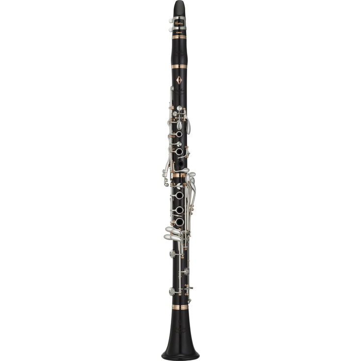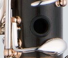 Clarinette Sib, série Custom, système Boehm, 18 clés, 6 anneaux, levier de Mib, clé de correction Fa grave/Mi grave, support de pouce réglable, 2 barils 65 et 66 mm, corps en grenadille, clétage en maillechort argenté ( boules, viroles et bosse de pouce aurifiés, couvre bec en résine ABS).