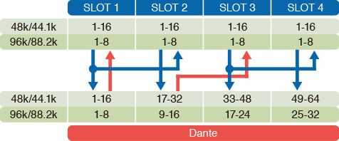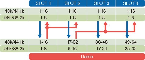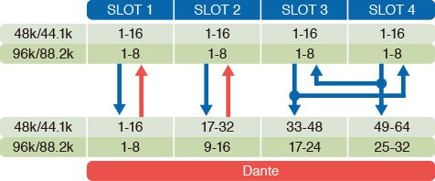 PATTERN 6 : Entrées Dante 1~16* vers les slots 1 et 2 / Entrées Dante 17~32* vers les slots 3 et 4