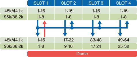 PATTERN 7 : Dante 1~32* et slots 1 et 2 one-to-one / Slots 3 et 4 mutualisés